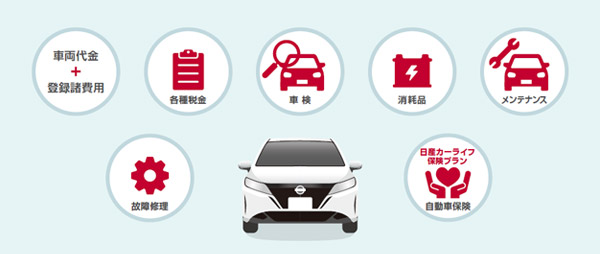 上記のシミュレーションの月額料金には、⾞両代金だけでなく、登録諸費⽤、契約期間中の⾃動⾞税、重量税、⾃賠責保険料、メンテナンス料⾦、車検代など、クルマの維持にかかる費用がコミコミになっています(駐車場代、ガソリン代等は除きます)。