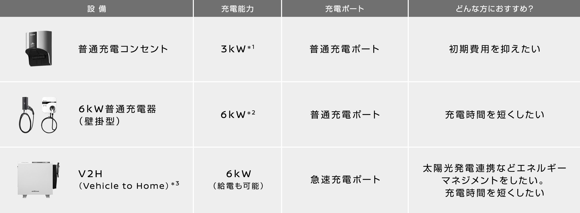 ご自宅での充電は3タイプ。お乗りのおクルマと用途に合わせてお選びいただけます。