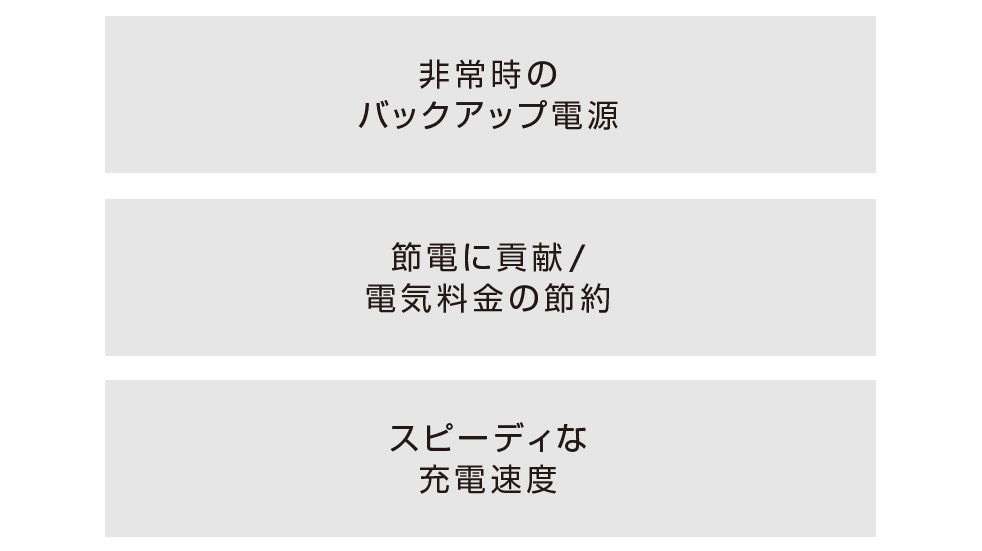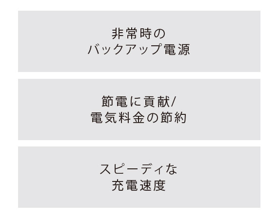 電気自動車の気持ちのいい走りに加え、EVバッテリーは優れたエネルギー源 として活躍します。家庭の電気代の節約や屋外・出先でも様々な電気製品の 電源として活用いただけます。