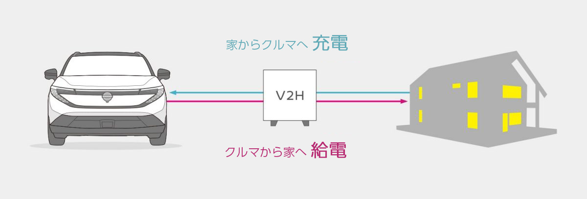 電気自動車にためた電気を家で使うことができるV2Hは、電気自動車の充電も可能です。