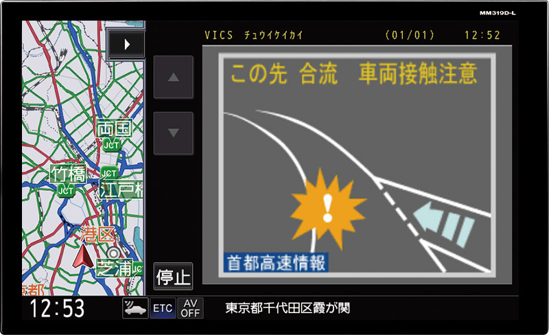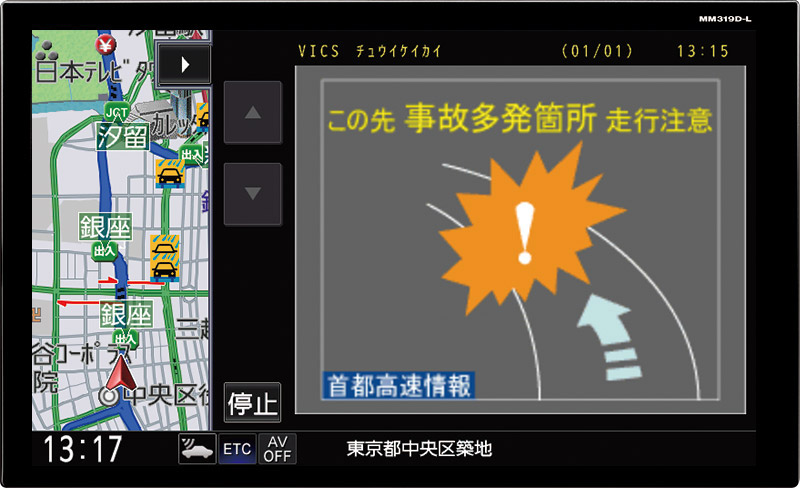 全国に設置されているITSスポットからの運転支援情報をナビ画面で確認。