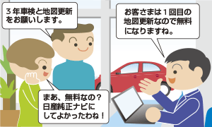 「無料クーポン」は一部機種を除き、通常は「ナビゲーションシステム取扱説明書」に添付しております。 - 販売会社に12ヶ月/24ヶ月法定点検または3年車検をご予約の際、「全国地図無料更新」をお申し込みください。