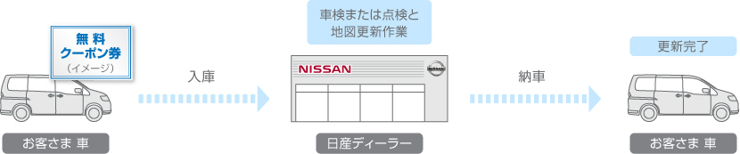(日産オリジナルナビゲーションNM1、NM1F、NJ1、NJ1Fはいつでもお申込みいただけます。) - ご入庫の際、販売会社に「無料クーポン」をお渡しください。