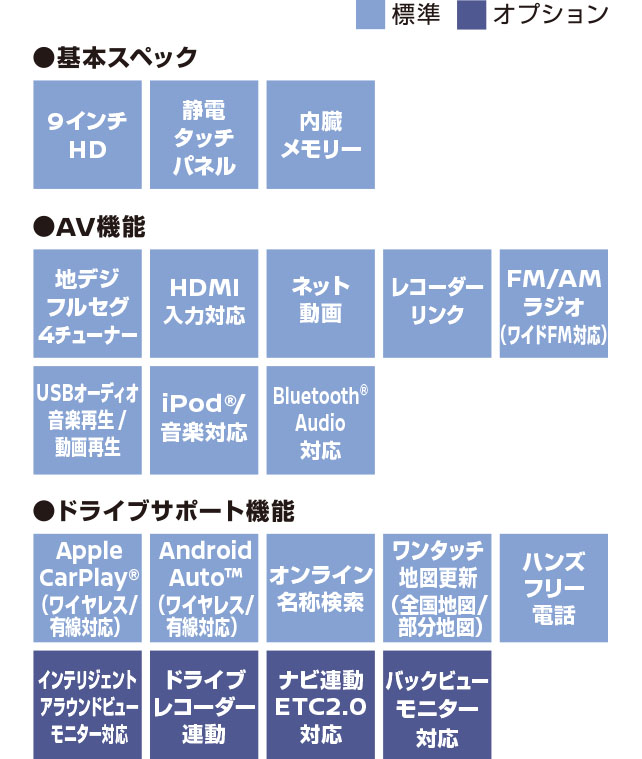 ワイヤレス Apple CarPlay、Android Auto™やネット動画、HDMI入力対応などの充実した「エンタメ機能」に加え、ワンタッチ地図更新やインテリジェント アラウンドビューモニターとの連携など「安心・簡単シンプル」な仕様で幅広いお客さまにオススメな、9インチ大画面モデル。