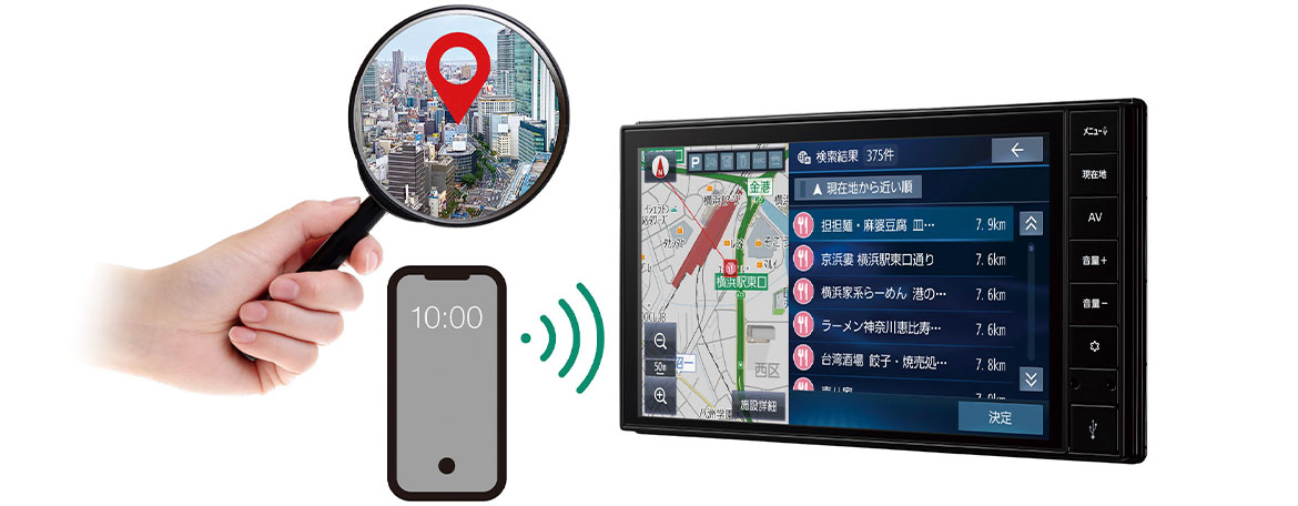 ナビに搭載された情報に加え、外部データサーバーに接続して目的地検索できるので、目的のお店や観光スポットをより快適に見つけられます。
