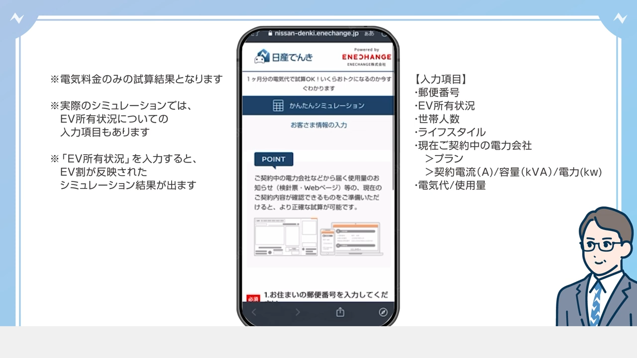 現在の電気料金または電気使用量で、日産でんきにご契約いただいた場合の年間電気料金をシミュレーションできます。